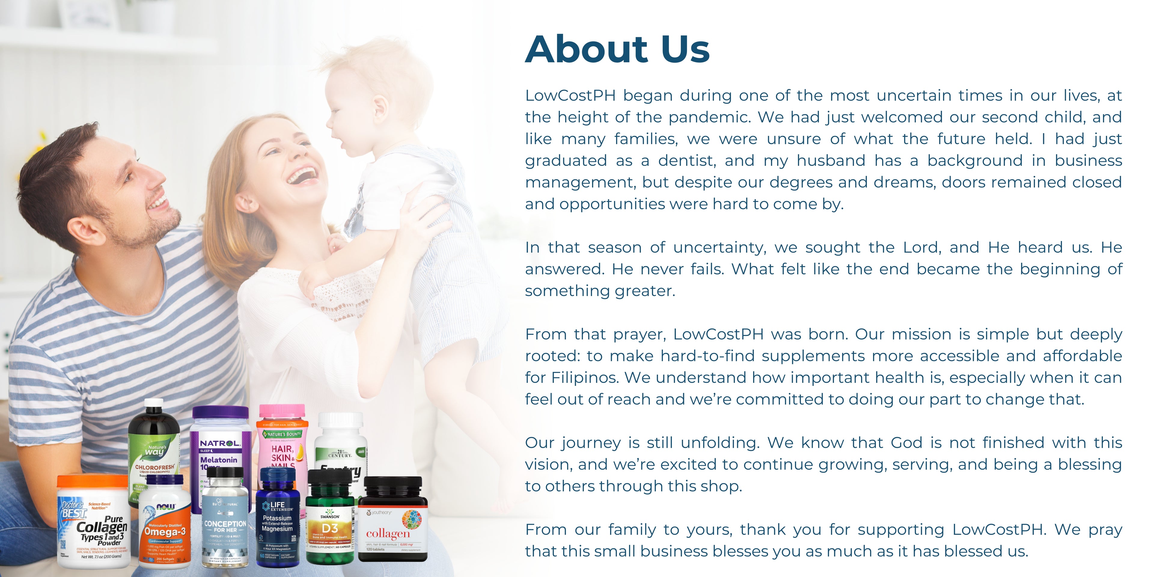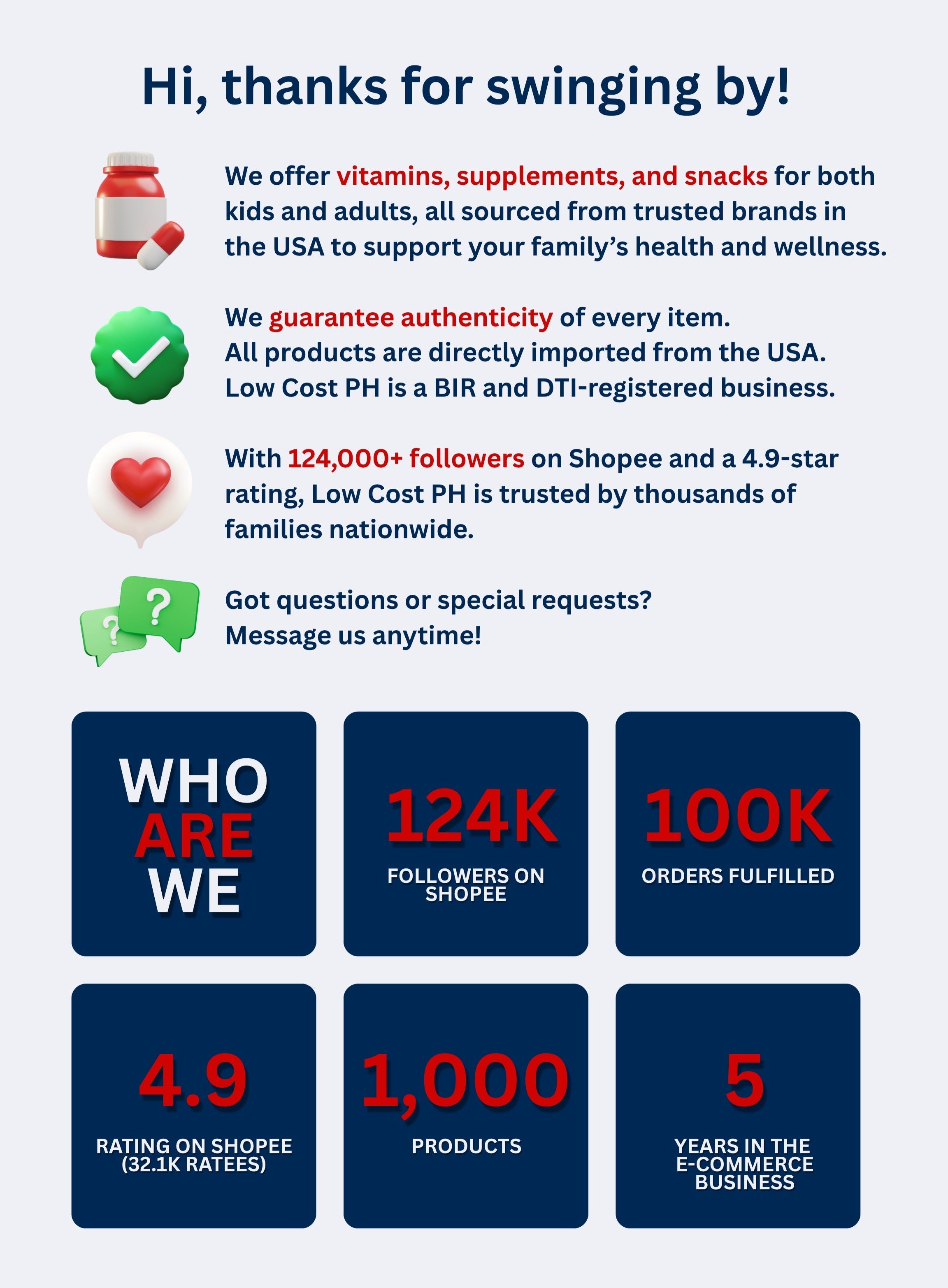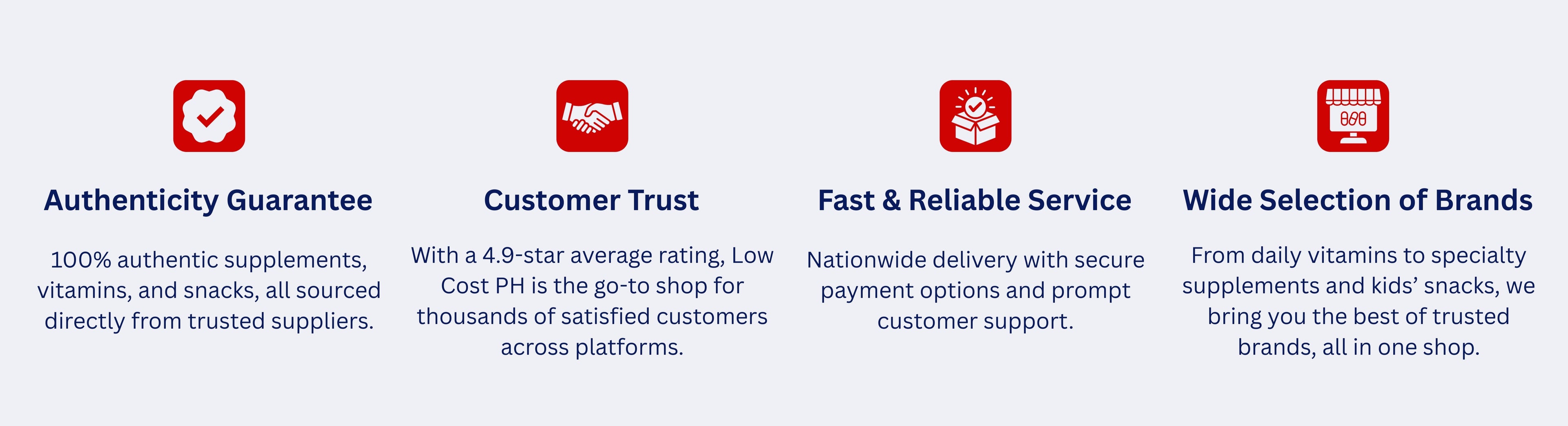 At Low Cost PH, we believe that good health should be accessible to everyone. That’s why thousands of Filipino families trust us for affordable, authentic supplements, vitamins, and kids' snacks, always at the lowest prices in the market.