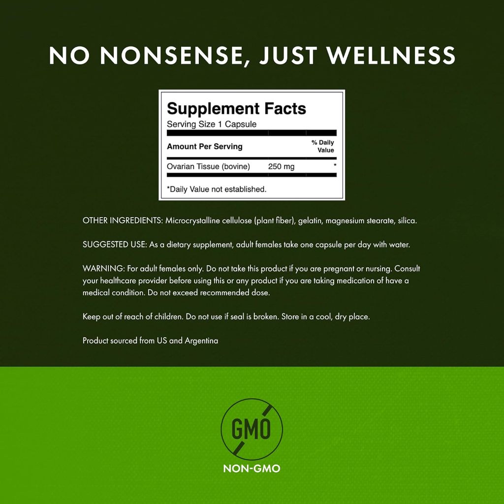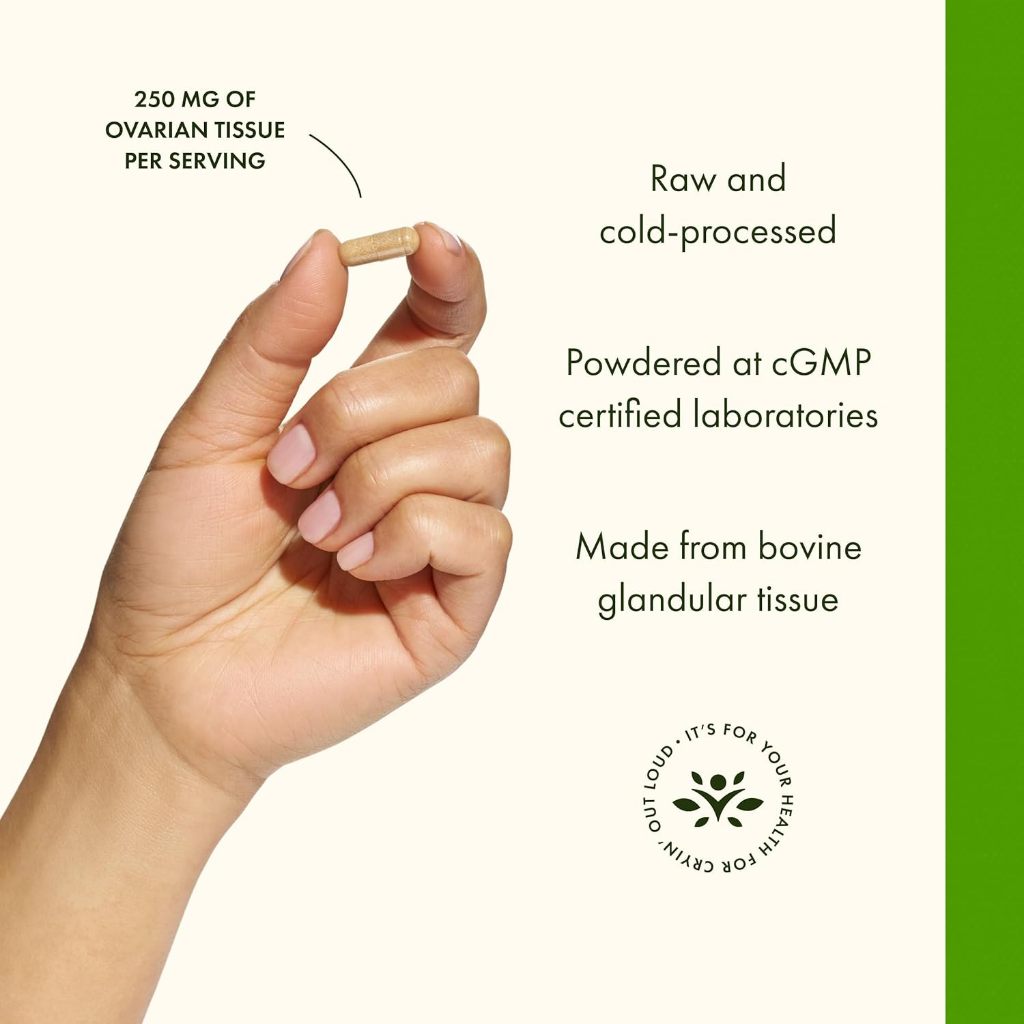 Each capsule contains 250 mg of raw bovine ovarian tissue, processed through freezing, drying, defatting, and powdering to preserve its active components.