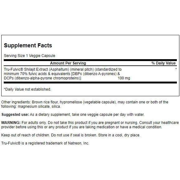 Active Ingredient: 100 mg of TruFulvic® Shilajit Extract, standardized to a minimum of 70% fulvic acid and enriched with dibenzo-alpha-pyrone chromoproteins (DCPs).