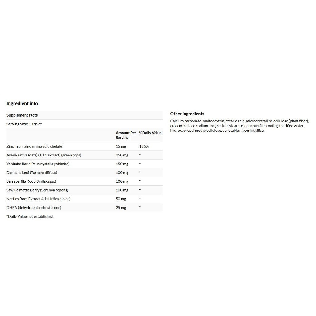 This product contains yohimbine, which may cause an elevation in blood pressure and heart rate, and should not be taken by people with cardiorenal diseases, ulcers, high blood pressure or hypersensitivity to any component. This product is unsuitable for women, children, geriatric patients and individuals with psychological disorders. Do not use with alcohol, mood-modifying drugs, antidepressants, tyramine-containing foods, such as liver, cheeses and red wine, or with over-The-counter (OTC) medications containing phenylpropanolamine (PPA). Discontinue use and consult your healthcare provider if dizziness, sleeplessness, tremors, nervousness, headache or heart palpitations occur. Not for use by individuals under the age of 18 years. Do not use if pregnant or nursing. Not recommended for women under age 35. Consult your physician or licensed, qualified healthcare professional before using this product if you have or have a family history of prostate cancer, prostate enlargement, heart disease, low "good" cholesterol (HDL) or if you are using any other dietary supplement, prescription drug or over-the-counter drug. Do not exceed recommended serving. Exceeding recommended serving may cause serious adverse health effects. Possible side effects include acne, hair loss, hair growth on the face (in women), aggressiveness,