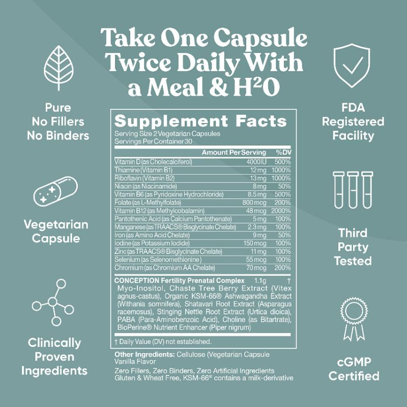 Taken to promote healthy fertility, conception provides essential vitamins, minerals, and herbal extracts to support your reproductive cycle.