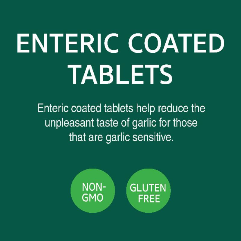 Enteric Coating Benefits: The enteric coating on these tablets helps prevent the garlic from being broken down in the stomach, which can reduce the risk of digestive discomfort and enhance the absorption of the active compounds in the intestines.