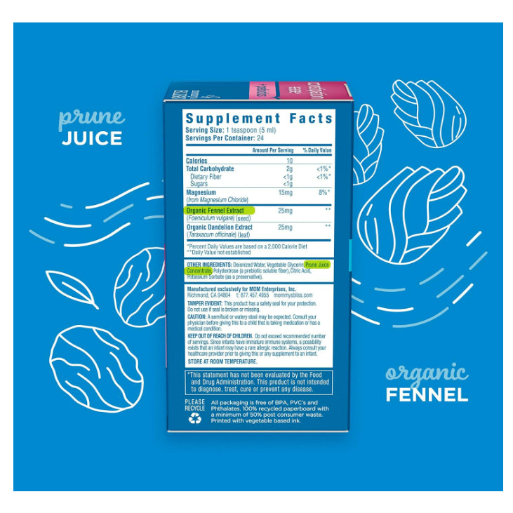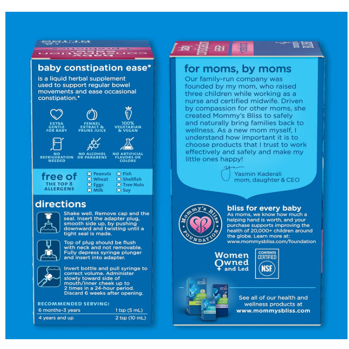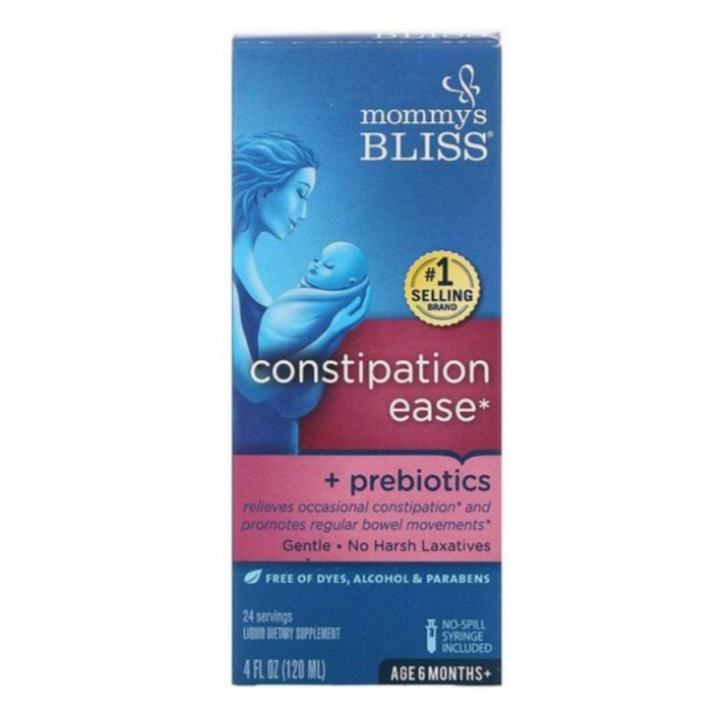 Mommy's Bliss Baby Constipation Ease is a liquid dietary supplement designed for infants aged 6 months and older to help alleviate constipation. It typically contains ingredients that are intended to promote regular bowel movements and ease discomfort. Here’s a look at the potential benefits and how it works: