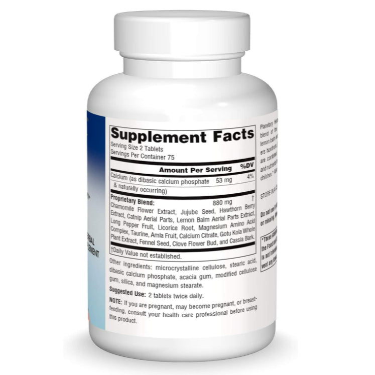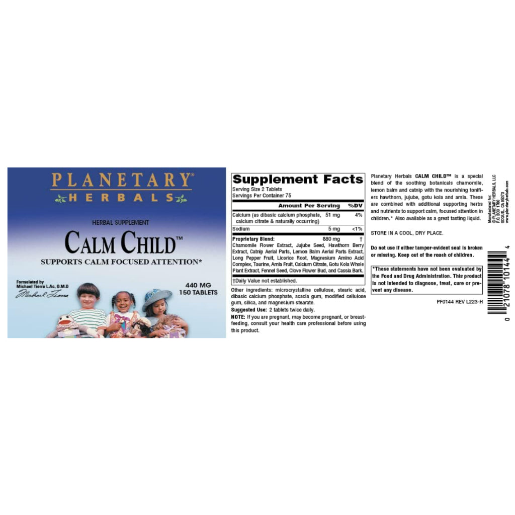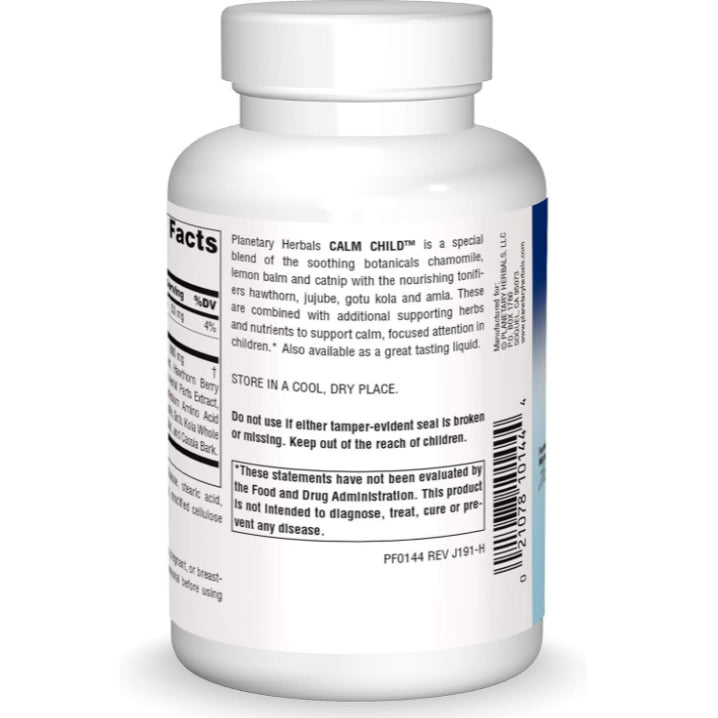 Planetary Herbals Calm Child is a special blend of the soothing botanicals chamomile, lemon balm and catnip with the nourishing tonifiers hawthorn, jujube, gotu kola extract and amla. These are combined with additional supporting herbs and nutrients to support calm, focused attention in children. Also available as a great tasting liquid.