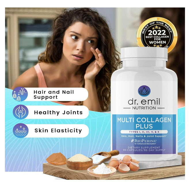 DR. EMIL NUTRITION Multi Collagen Pills - Collagen Supplements to Support Hair, Skin, Nails, & Joints - Hydrolyzed Collagen Supplements for Women with Types I, II, III, V & X - 90 Capsules