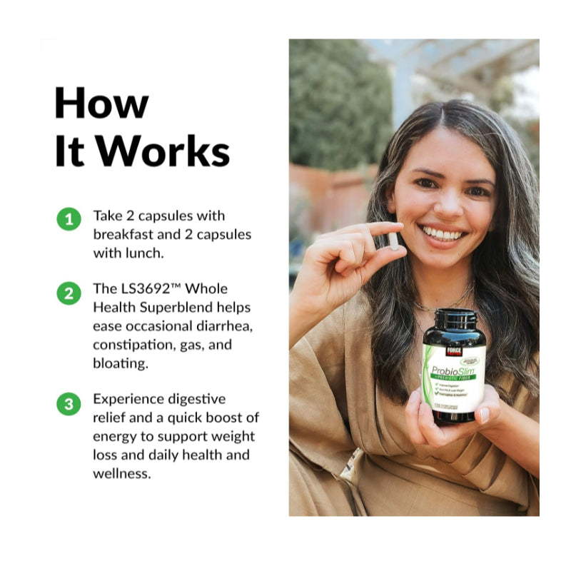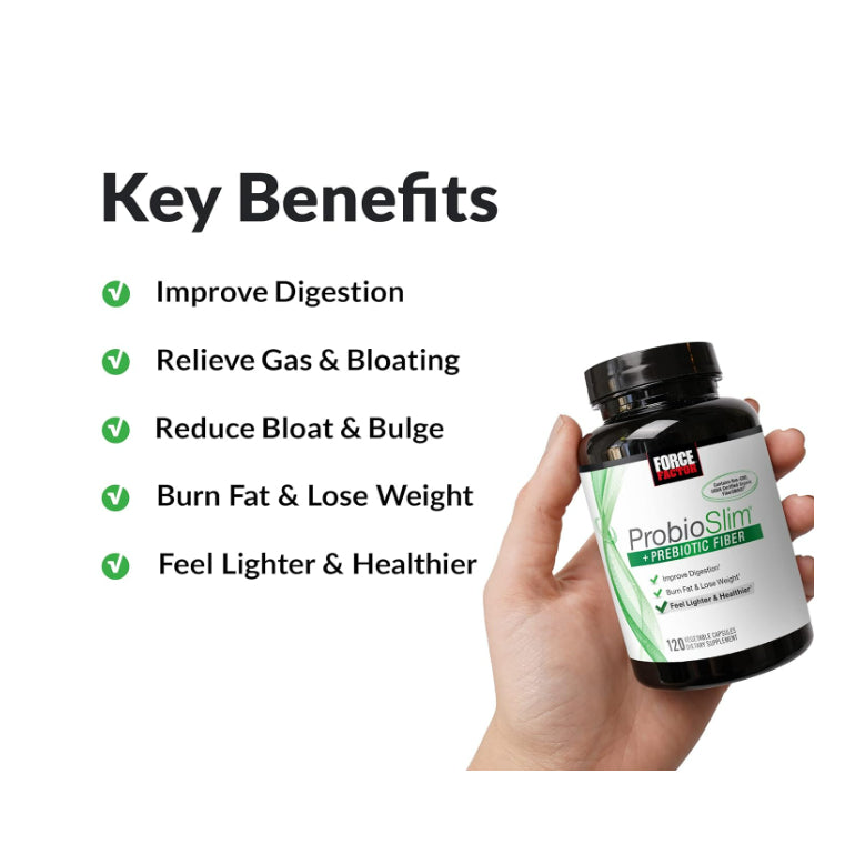 Force Factor ProbioSlim + Prebiotic Fiber (120 Vegetable Capsules) is designed to support digestive health by combining probiotics, prebiotics, and other ingredients. Here are the key health benefits: