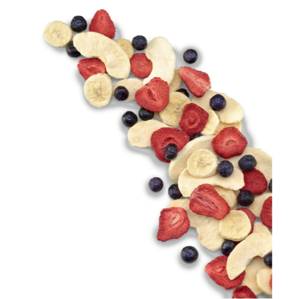 Sun ripened, pure freeze-dried real fruit slices are the perfect mix of sweet and tart. Flavorful mix of strawberries, bananas, apples and blueberries.
