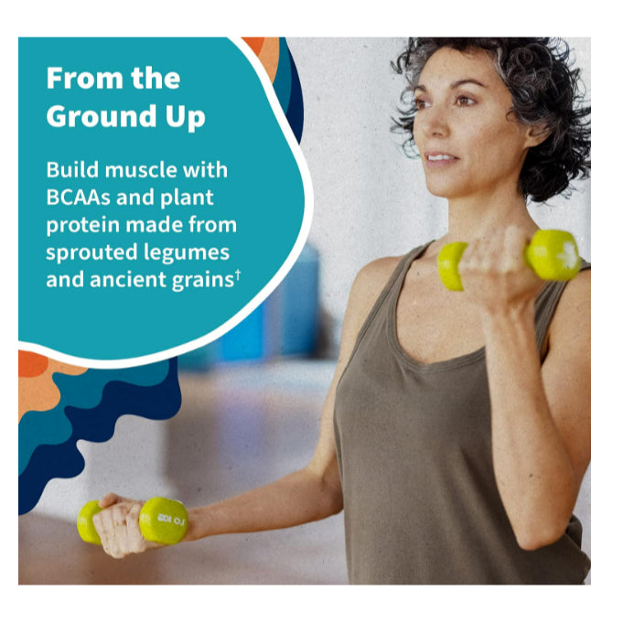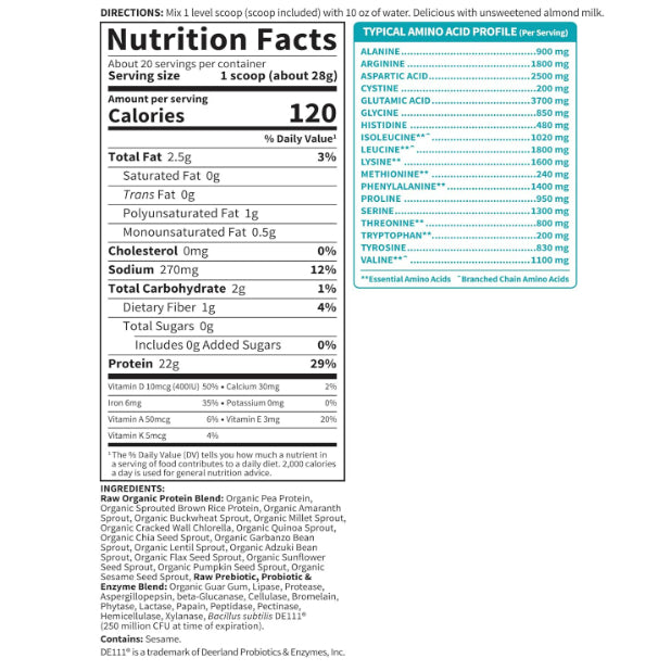 This product contains a blend of 13 raw sprouted proteins, including pea protein, chia seed, amaranth, quinoa, pumpkin seeds, and more. It provides a complete profile of essential amino acids, making it ideal for those following a plant-based or vegan diet.