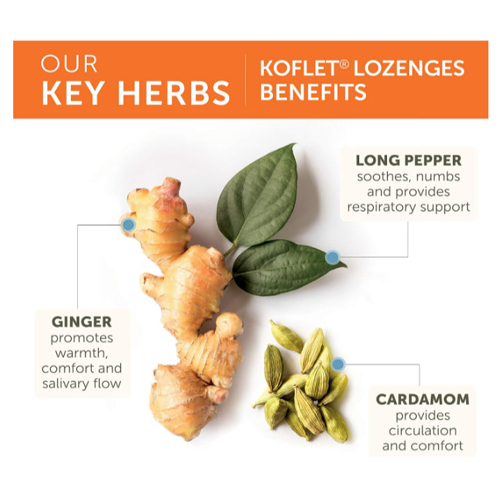 The herbal ingredients make Koflet lozenges a natural and gentle option for respiratory and throat care, suitable for people looking for plant-based remedies without synthetic additives.