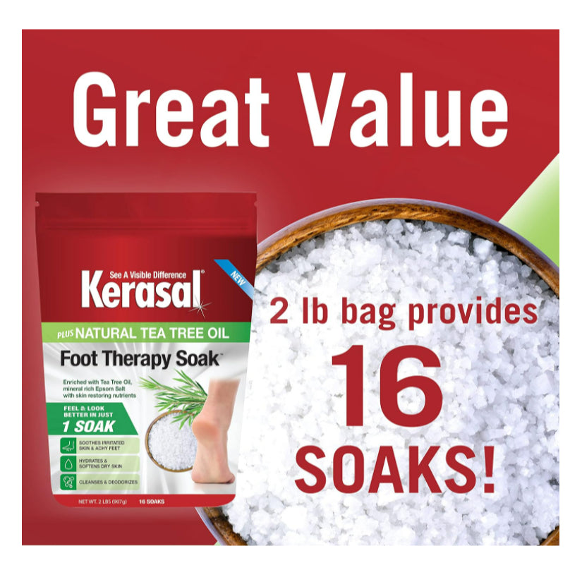Kerasal Foot Therapy Soak Plus Natural Tea Tree Oil is a foot care product designed to soothe and treat tired, dry, or achy feet. It combines ingredients like Epsom salt and tea tree oil, known for their therapeutic and healing properties. Here are its key health benefits:
