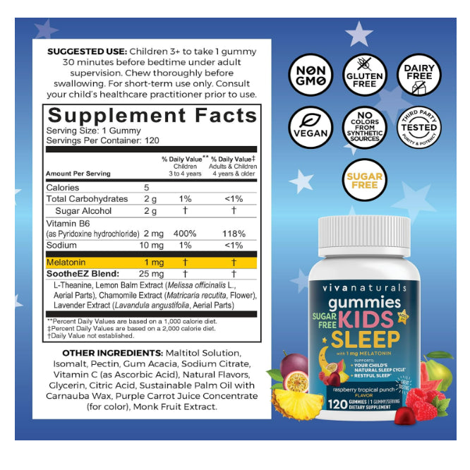 ✔THE VIVA NATURALS DIFFERENCE - Not only are our kid melatonin gummies delicious, but they are sugar-free, gluten-free, dairy-free and made without GMOs. Purity and potency have been third-party tested.