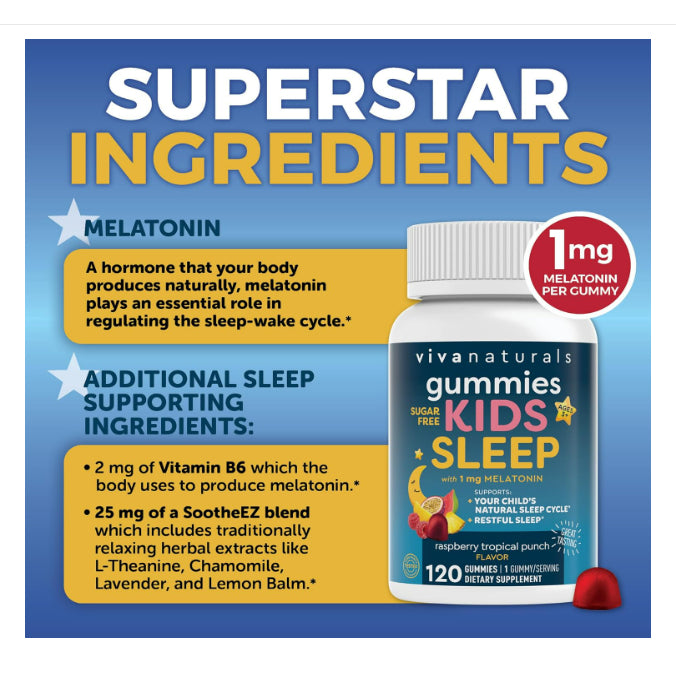 Melatonin (1 mg): A naturally occurring hormone that plays a key role in regulating sleep cycles. The 1 mg dosage is generally considered safe and effective for children.