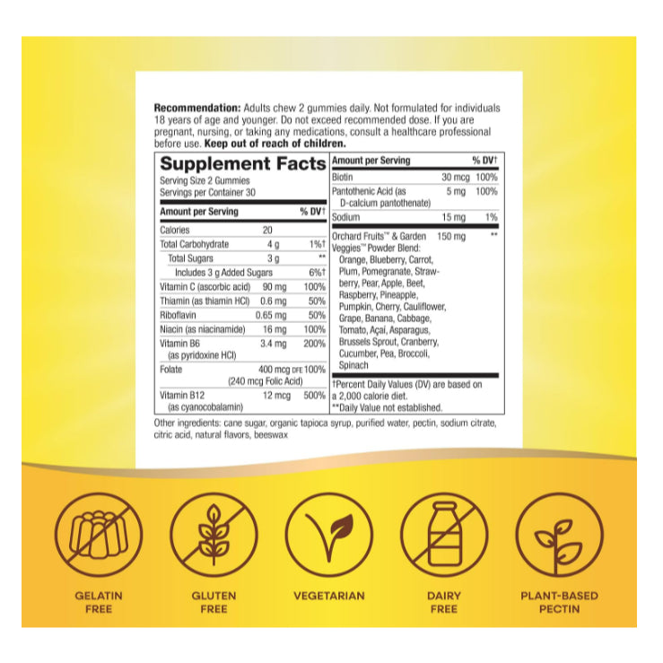 B Vitamins: The B-complex vitamins (B1, B2, B3, B5, B6, B7, B9, B12) in these gummies help convert the food you eat into cellular energy. They play a critical role in the body’s energy production processes, helping to reduce fatigue and boost vitality throughout the day.