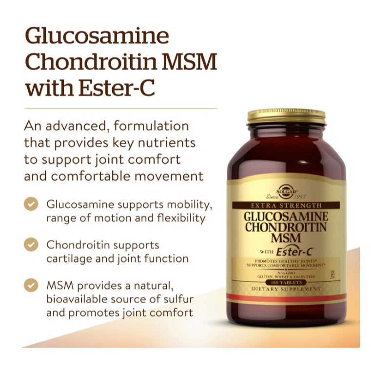 Solgar Extra Strength Glucosamine Chondroitin MSM with Ester-C is a joint health supplement formulated to support joint comfort, mobility, and collagen formation. This product combines glucosamine, chondroitin, MSM, and Ester-C to promote joint integrity and ease of movement. Here’s a look at its main benefits: