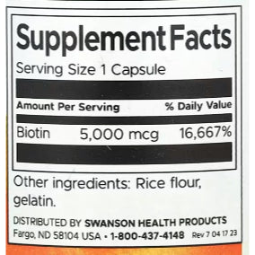 Swanson Biotin (5,000 mcg, 100 Capsules) is a high-dose biotin supplement designed to support various aspects of health, particularly those related to hair, skin, and nails. Biotin, also known as vitamin B7, is a water-soluble vitamin that plays a crucial role in energy metabolism and the maintenance of healthy bodily functions.