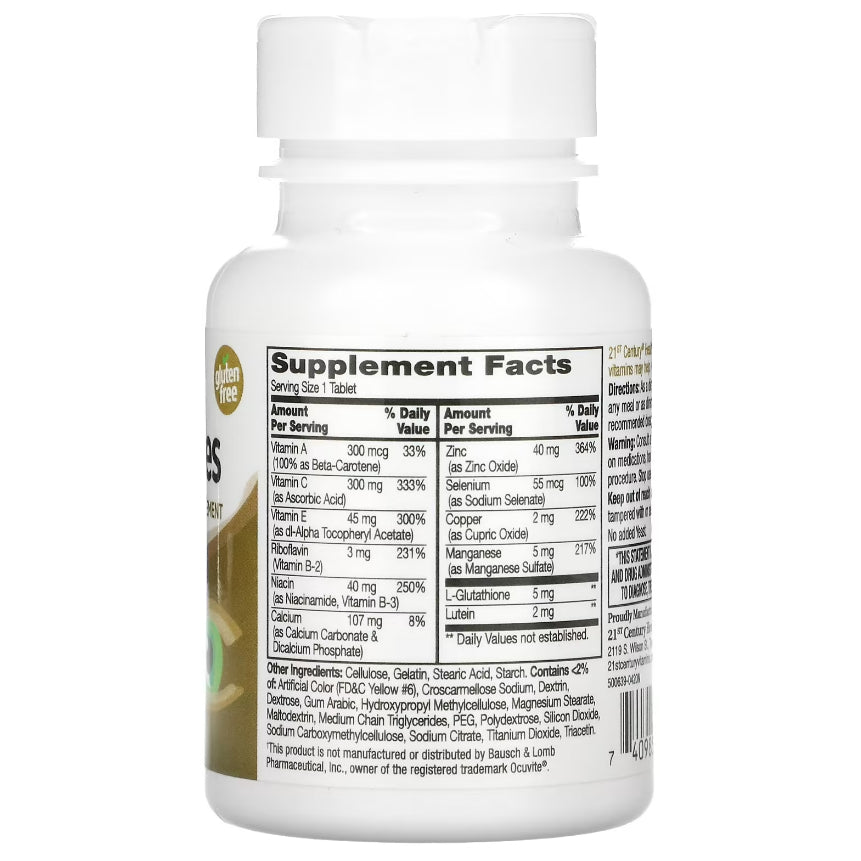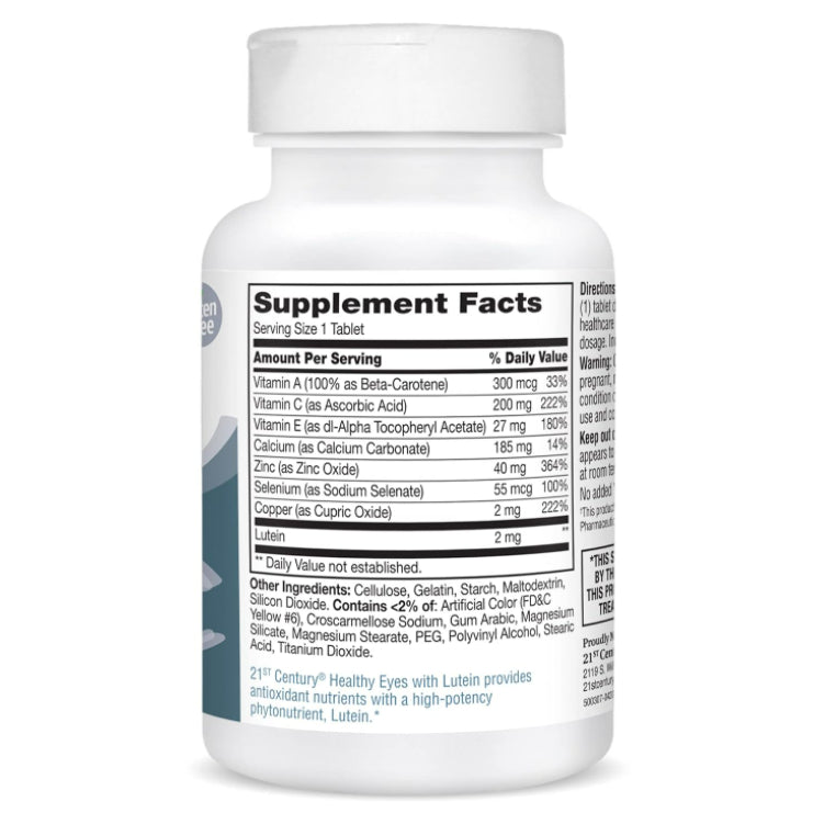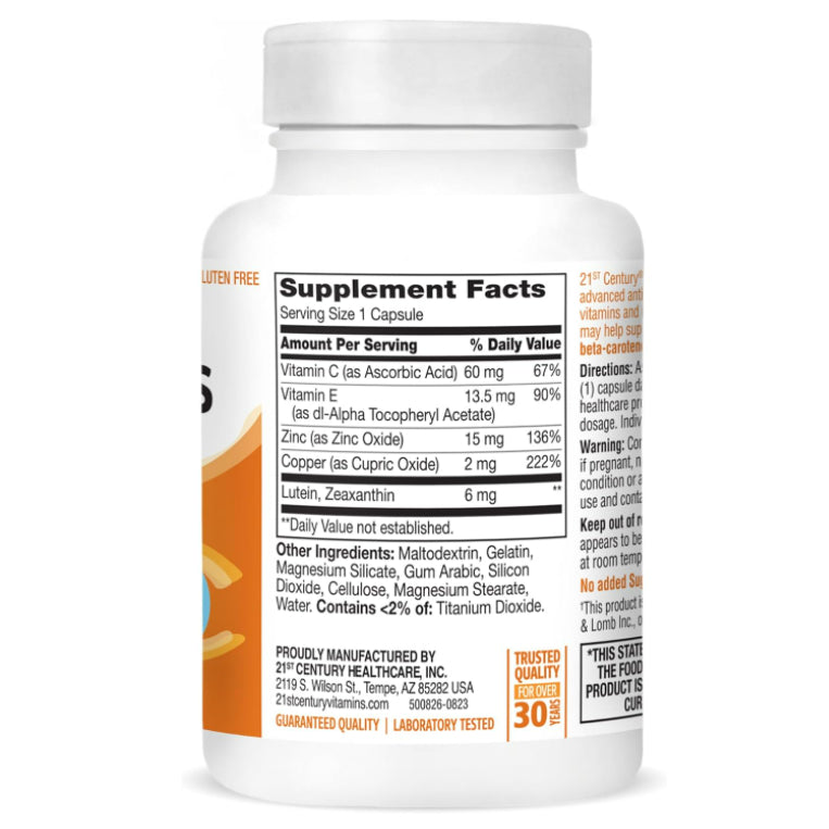 21st Century® Healthy Eyes Lutein & Zeaxanthin is an advanced antioxidant formula containing essential vitamins and minerals plus lutein & zeaxanthin that may help support eye function. This product is beta-carotene free.