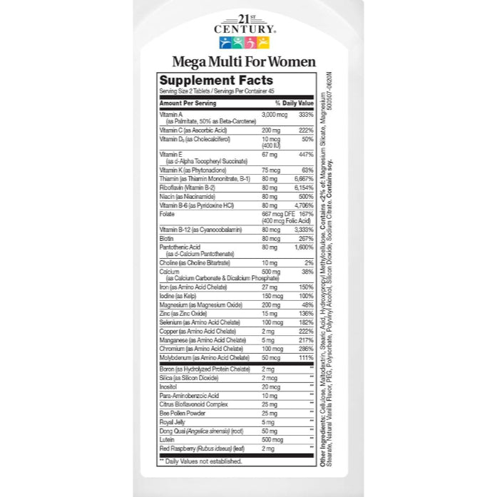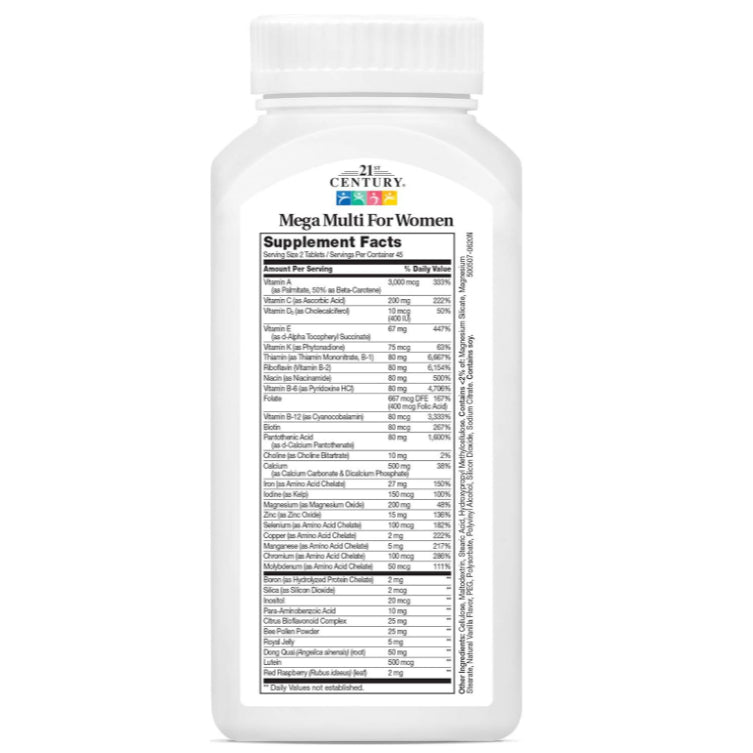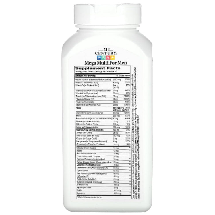 "21st Century Mega Multi For Men" and "21st Century Mega Multi For Women" are dietary supplements designed to provide a range of vitamins and minerals to support the nutritional needs of men and women, respectively. These supplements are formulated to address specific gender-related health considerations. Here are some key features and potential benefits associated with these multivitamin supplements: