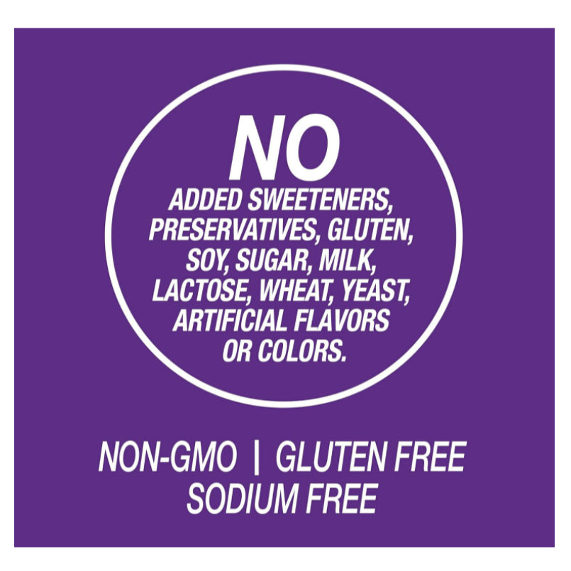 No added sweetener, preservatives, gluten, soy, sugar, milk, lactose, wheat, yeast, artificial flavors or colors. Sodium free.