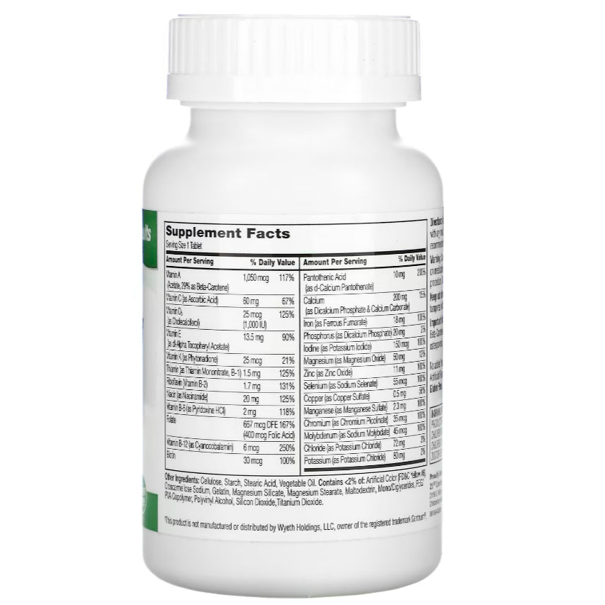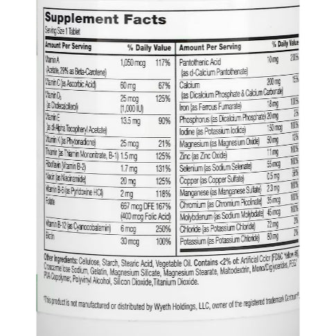 Starch, cellulose, stearic acid. Contains <2% of: Artificial colors (fd&c blue #2 carmine, fd&c red #40, fd&c yellow #6), ascorbyl palmitate, bha, bht, citric acid, corn oil, croscarmellose sodium, dl-alpha tocopherol, ethylcellulose, gelatin, gum arabic, magnesium silicate, magnesium stearate, maltodextrin, mannitol, mono/diglycerides, peg/pva copolymer, polyvinyl alcohol, silicon dioxide, sodium aluminosilicate, sodium ascorbate, sucrose, titanium dioxide, vegetable oil, vitamin E oil, water.