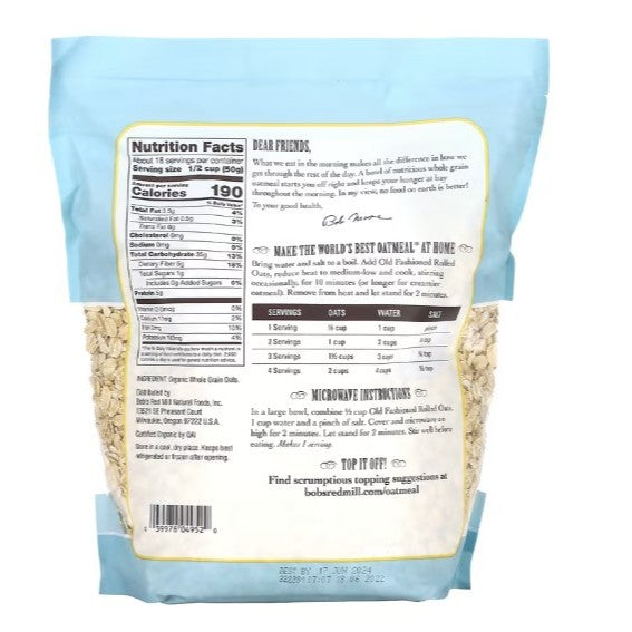 High in Fiber: Bob's Red Mill Organic Old Fashioned Rolled Oats are a great source of both soluble and insoluble fiber, which supports digestive health, helps lower cholesterol, and promotes feelings of fullness.