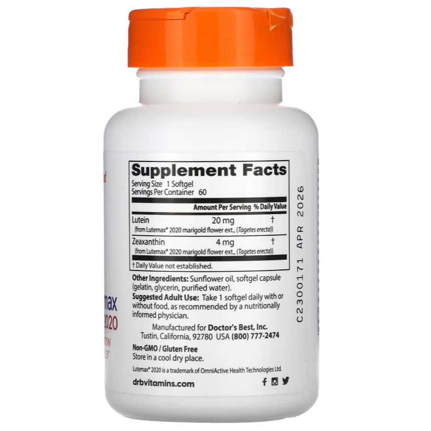 ### Doctor's Best Lutein with Lutemax 2020, 20 mg, 180 Softgels: