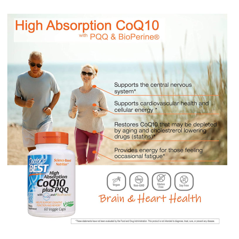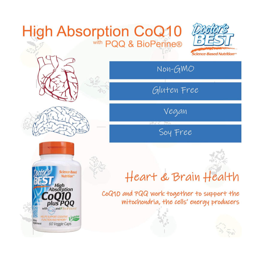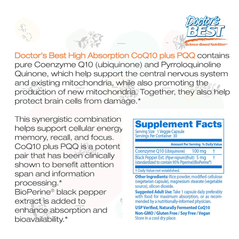 Doctor's Best High Absorption CoQ10 plus PQQ contains pure Coenzyme Q10 (Ubiquinone) and Pyrroloquinoline Quinone, which help support the central nervous system and existing mitochondria, while also promoting the production of new mitochondria. Together, they also help protect brain cells from damage.