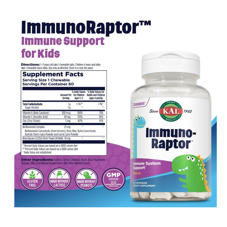 Fun to Chomp: A great-tasting way to give your kids the Vitamin C they need to stay healthy and strong, our fun, dinosaur-shaped ImmunoRaptor chewables come with a tasty natural orange flavor children love.