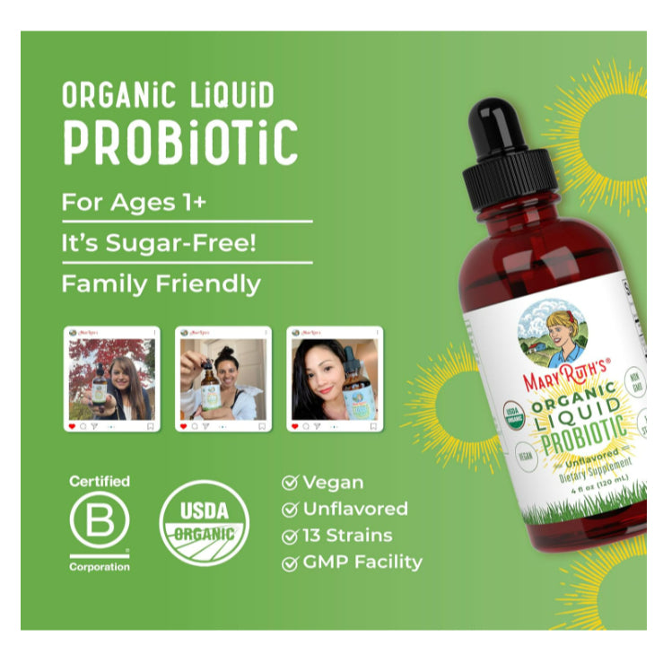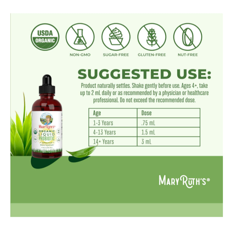 Simple Ingredients: MaryRuth's Organic Liquid Probiotic is USDA Organic, Non-GMO, and Vegan. Dairy Free, Nut Free, Gluten Free, Soy Free, Sugar Free. Clean Label Project Certified. B Corp Certified. Our 4 oz bottle comes with 40 servings.