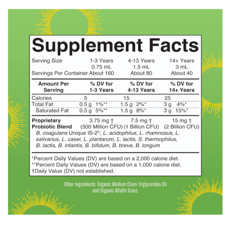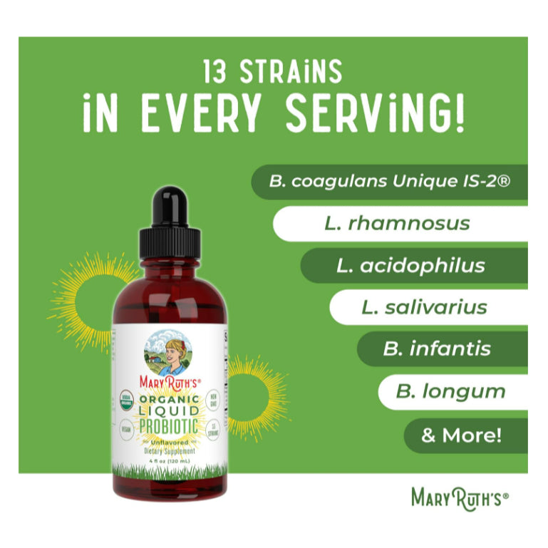USDA Organic Liquid Probiotic: This vegan USDA Certified Organic Liquid Probiotic is formulated with 13 unique probiotic strains. Formulated for ages 1+, this probiotic for men, women, and kids can easily be dosed for the whole family! This proprietary probiotic blend contains up to 2 billion CFU per serving.