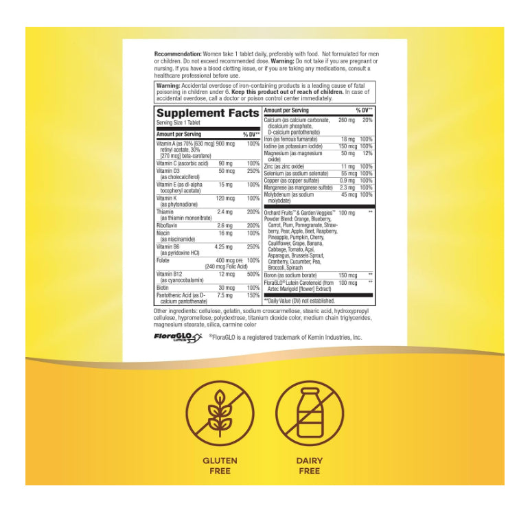 Support for Women's Health: This multivitamin-multimineral supplement includes nutrients that are important for women's health, such as iron, calcium, magnesium, and vitamin D. These nutrients support bone health, menstrual health, and overall well-being in women.