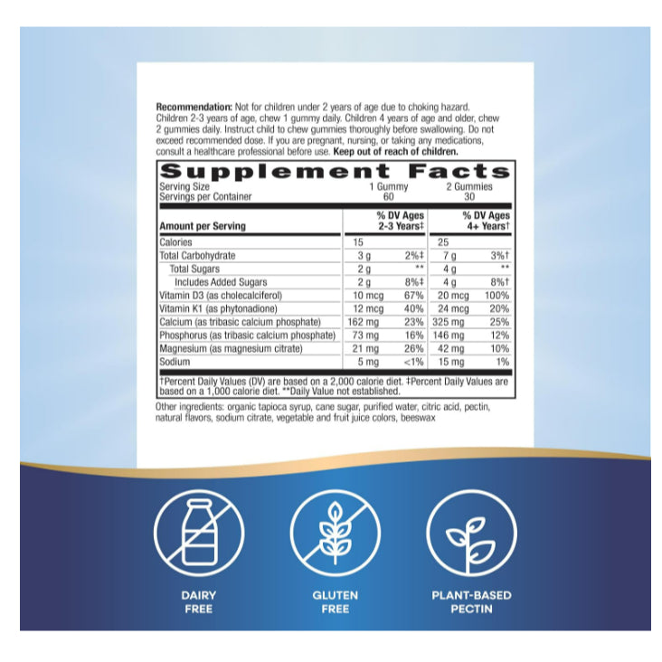Not for children under 2 years of age due to choking hazard. Children 2-3 years of age, chew 1 gummy daily. Children 4 years of age and older, chew 2 gummies daily. Instruct child to chew gummies thoroughly before swallowing. Do not exceed recommended dose. If you are pregnant, nursing, or taking any medications, consult a healthcare professional before use.