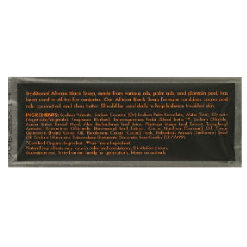 Traditional African Black Soap, made from various oils, palm ash, and plantain peel, has been used in Africa for centuries. Our African Black Soap formula combines cocoa pod ash, coconut oil, and shea butter. Should be used daily to help balance troubled skin.