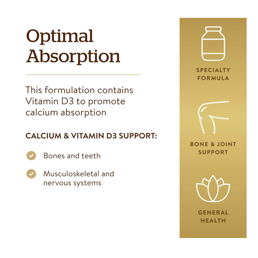 Calcium Absorption; This formulation contains 600 IU Vitamin D3 to promote calcium absorption; Adequate calcium and Vitamin D, along with a healthful diet & physical activity, may reduce the risk of osteoporosis in later life