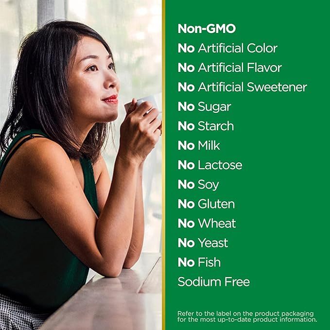 Non-GMO, no artificial color, no artificial flavor, no artificial sweetener, no preservatives, no sugar, no starch, no milk, no lactose, no soy, no gluten, no wheat, no yeast, no fish.