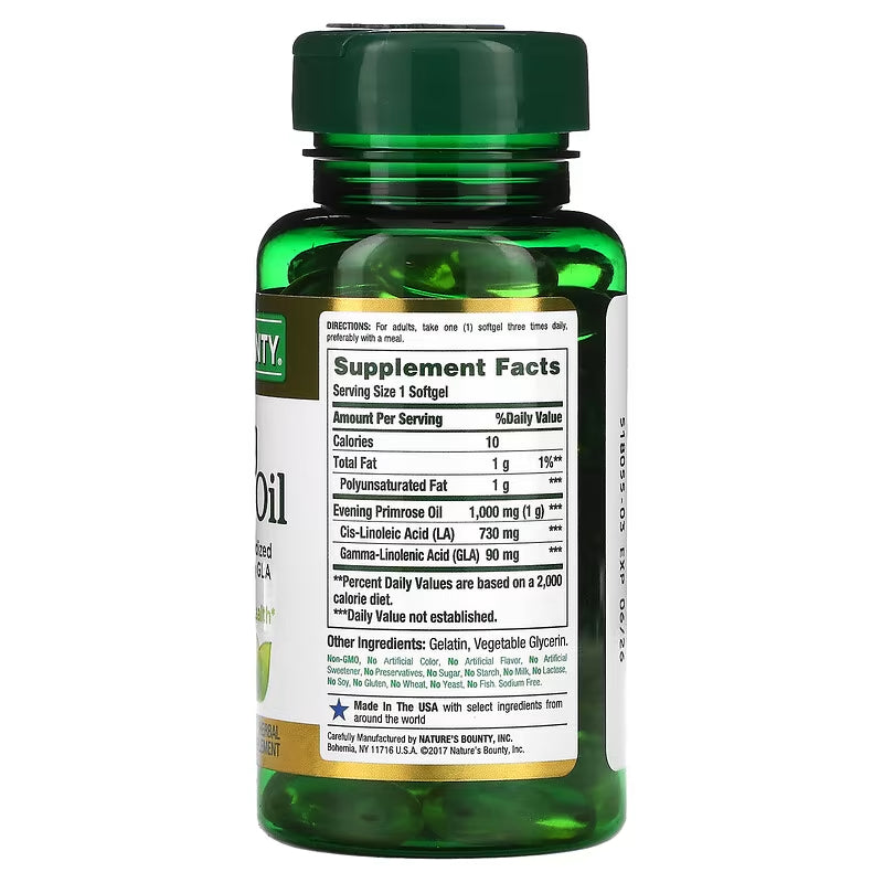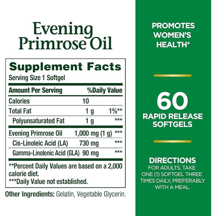 Nature's Bounty Evening Primrose Oil is a dietary supplement that provides 1,000 mg of evening primrose oil per softgel, with 60 rapid-release softgels in the bottle. Evening primrose oil is derived from the seeds of the evening primrose plant and is known for its potential health benefits, primarily due to its high content of gamma-linolenic acid (GLA), an omega-6 fatty acid.
