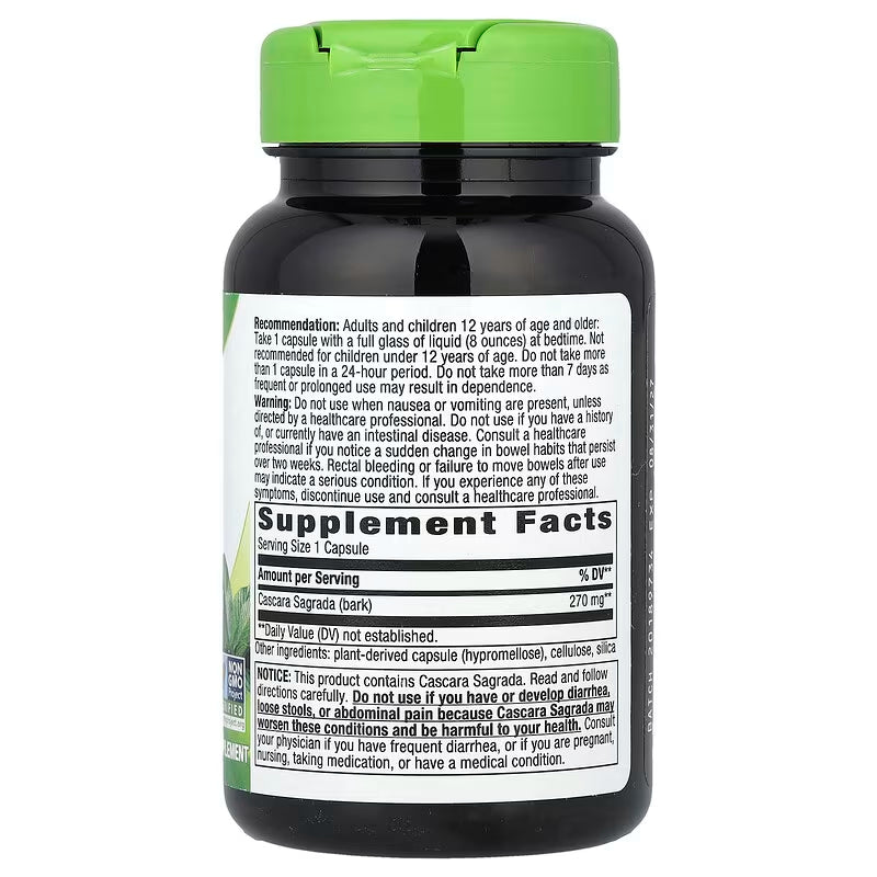 Each capsule contains 270 mg of cascara sagrada bark. The formula is vegan, non-GMO, gluten-free, and free from artificial additives.