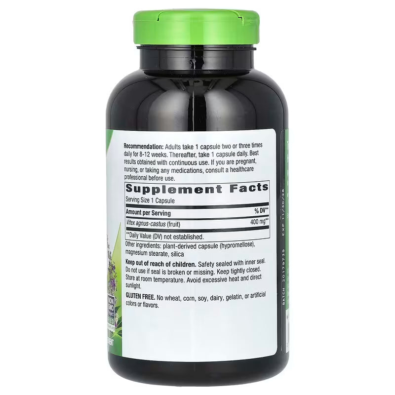 Nature's Way Vitex Fruit, 400 mg, is a dietary supplement made from the fruit of the Vitex agnus-castus plant, also known as chaste tree. Vitex is commonly used in herbal medicine for its potential benefits related to women's health. Here are the key benefits and uses of this supplement: