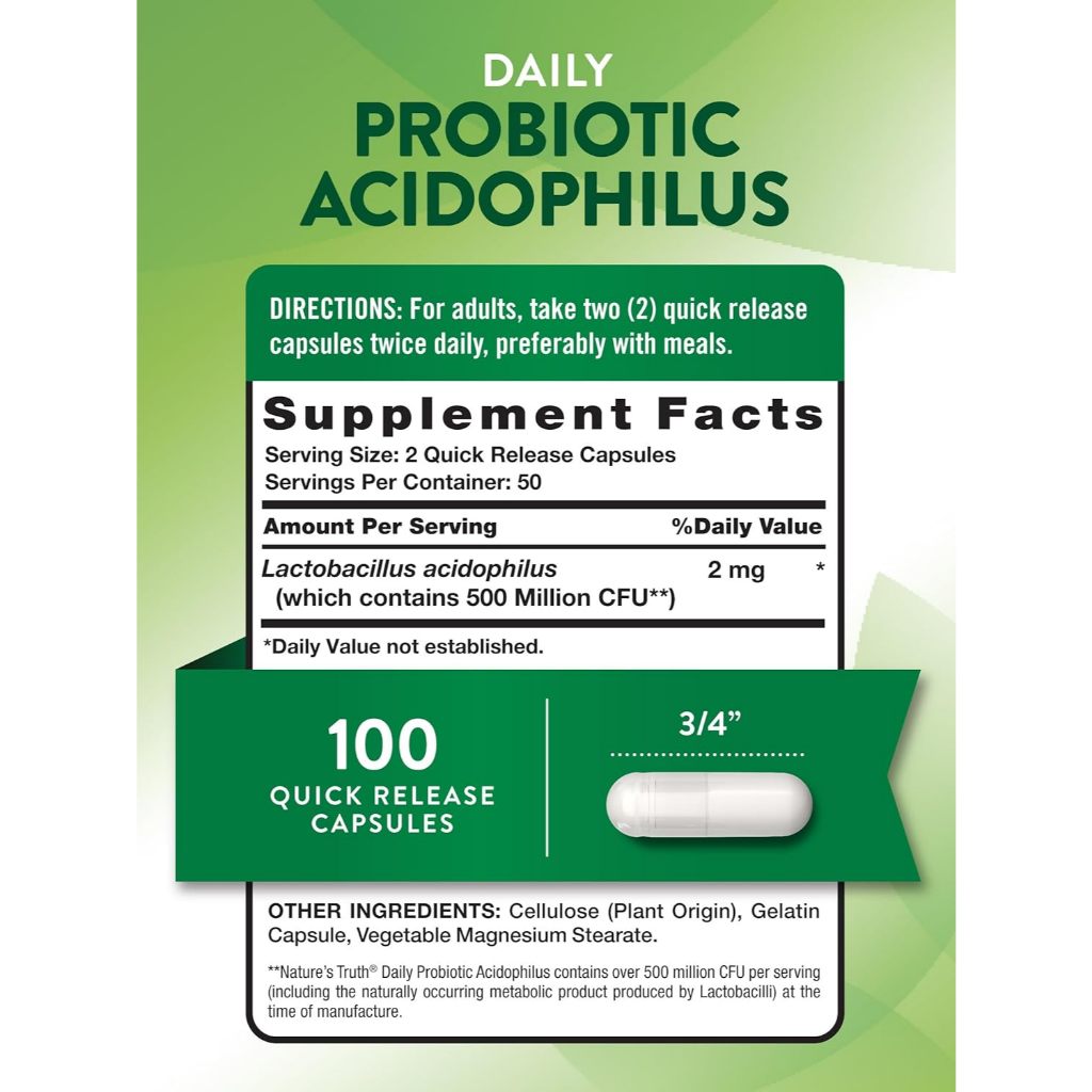 Dosage: Each capsule contains 1 mg of probiotic acidophilus, and with 100 capsules in the bottle, it offers a long supply.