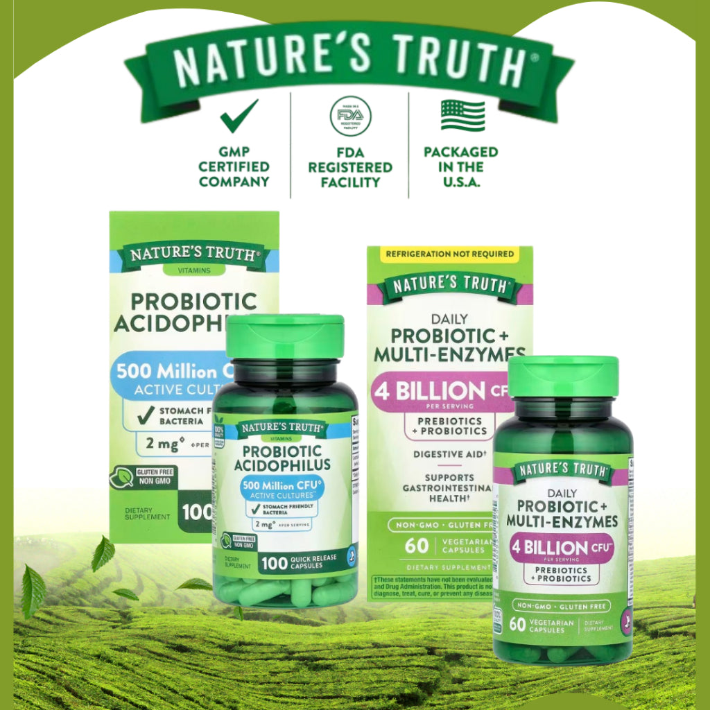 ** Nature's Truth® Probiotic + Multi-Enzymes contains over 4 billion CFUs per serving (including the naturally-occurring metabolic products produced by Lactobacilli) at the time of manufacture.