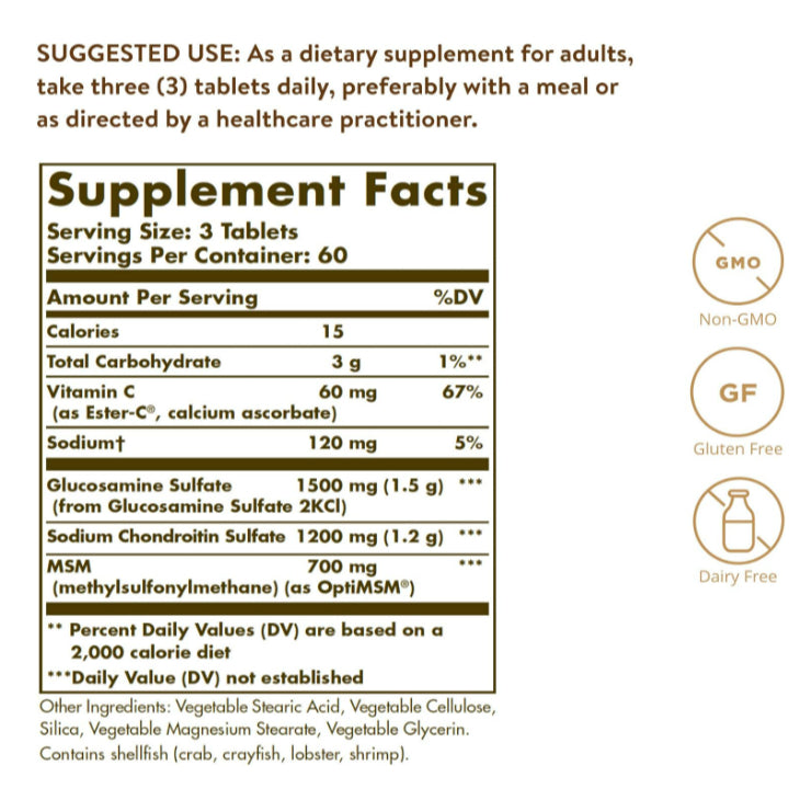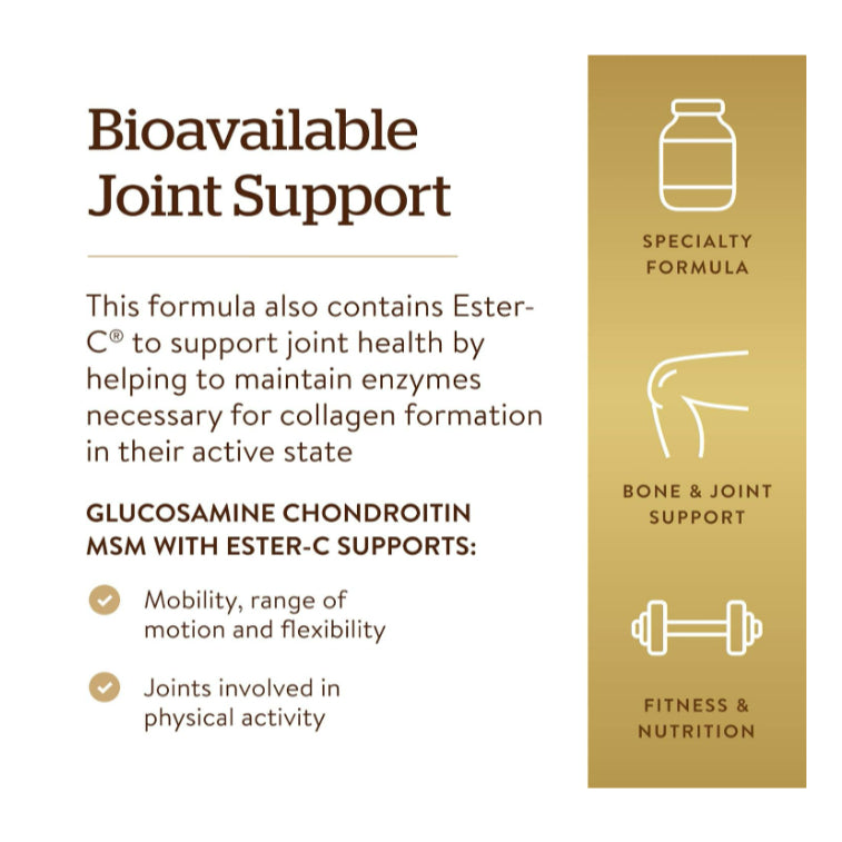 Solgar Extra Strength Glucosamine Chondroitin MSM with Ester-C is a joint health supplement formulated to support joint comfort, mobility, and collagen formation. This product combines glucosamine, chondroitin, MSM, and Ester-C to promote joint integrity and ease of movement. Here’s a look at its main benefits: