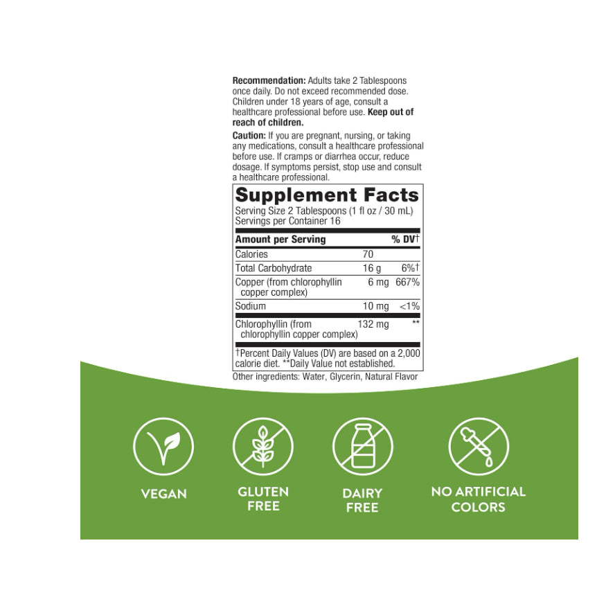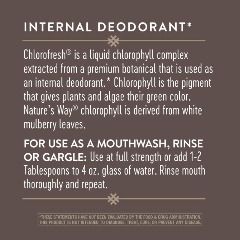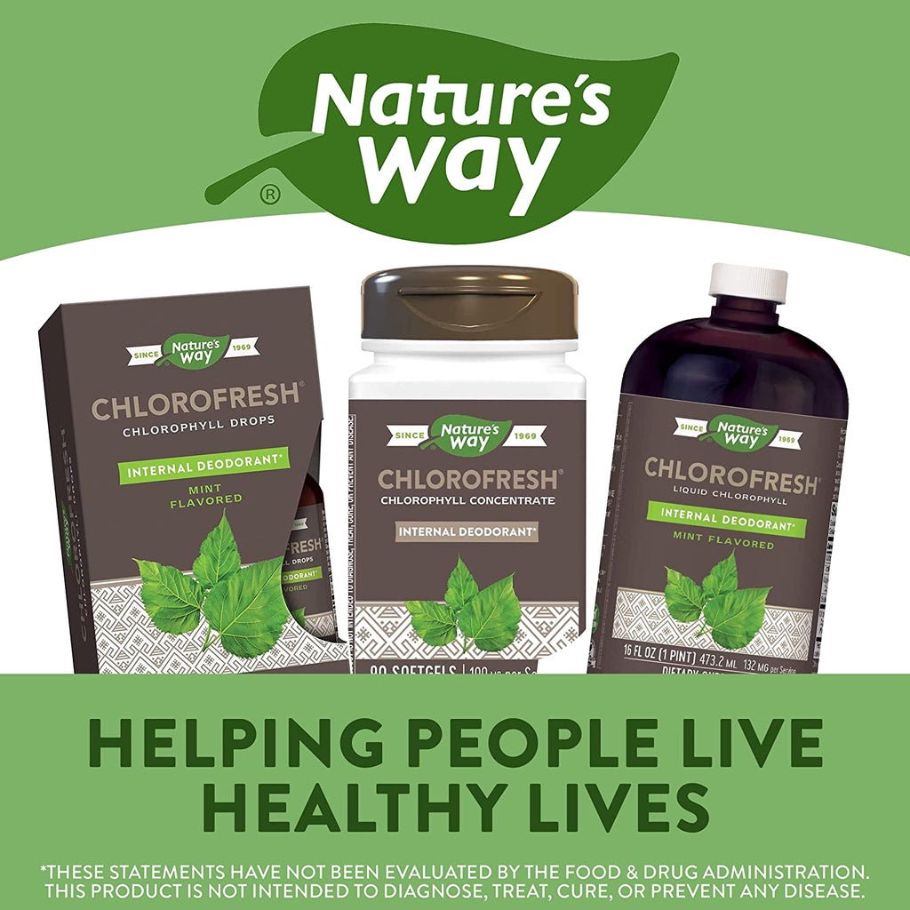 Nature's Way Chlorofresh Liquid Chlorophyll, Mint Flavor, is a dietary supplement derived from chlorophyll, the green pigment found in plants. Here are some potential benefits associated with its use: