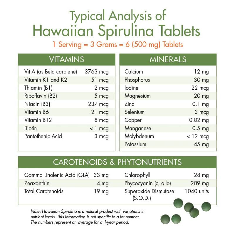 Naturally contains vitamins A, K, and B12, magnesium, phycocyanin, GLA, chlorophyll, and zeaxanthin