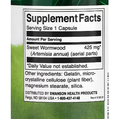 Swanson Full Spectrum Sweet Wormwood (Artemisia annua) is a dietary supplement that provides 425 mg of sweet wormwood per capsule. Sweet wormwood is a plant traditionally used in herbal medicine for various health benefits, especially its potential role in supporting immune function and digestive health.