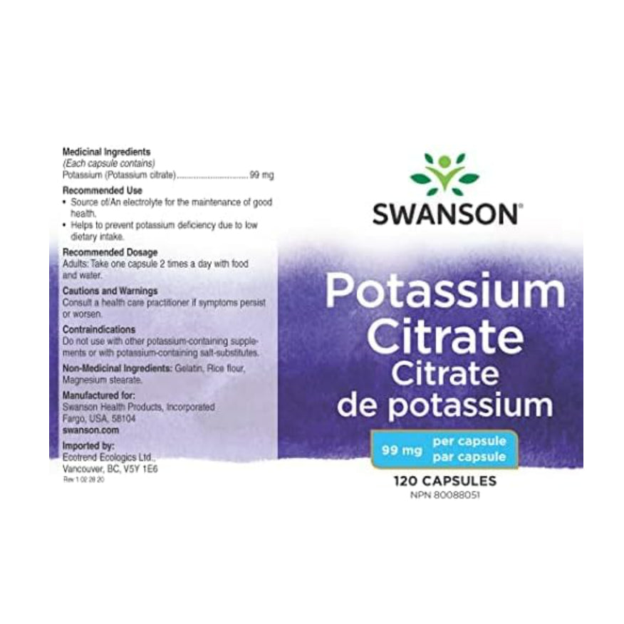 Swanson Potassium Citrate, 99 mg, 120 Capsules, is a dietary supplement providing potassium in the form of potassium citrate. Here's an overview of the product: