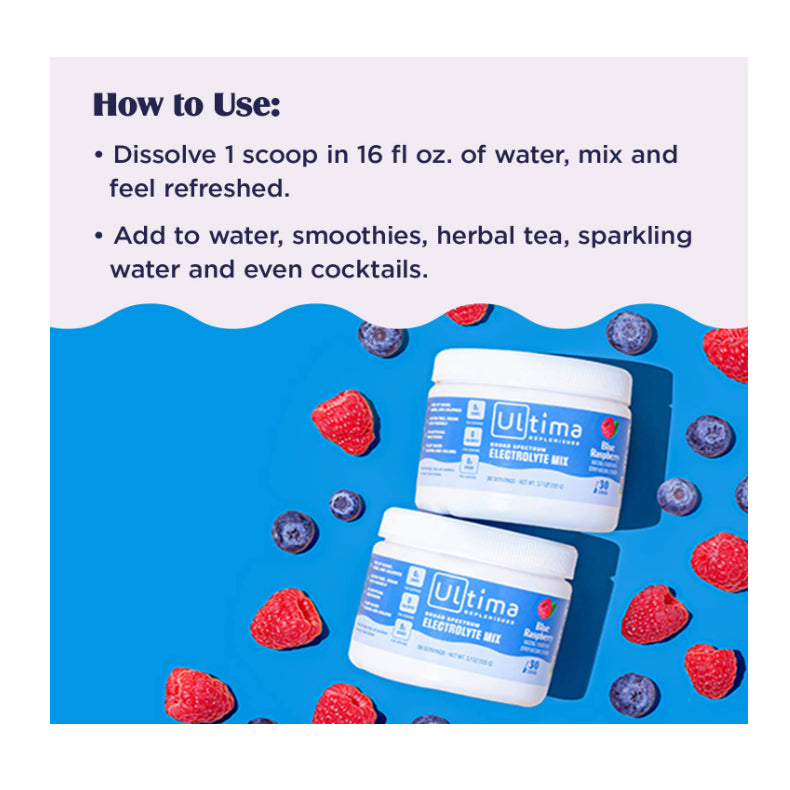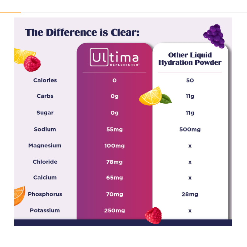 Electrolyte Balance: Maintaining proper electrolyte balance is important for overall health and well-being. Imbalances in electrolyte levels can lead to symptoms such as muscle cramps, fatigue, dizziness, and irregular heartbeat. Ultima Replenisher helps restore electrolyte balance, promoting overall health and vitality.