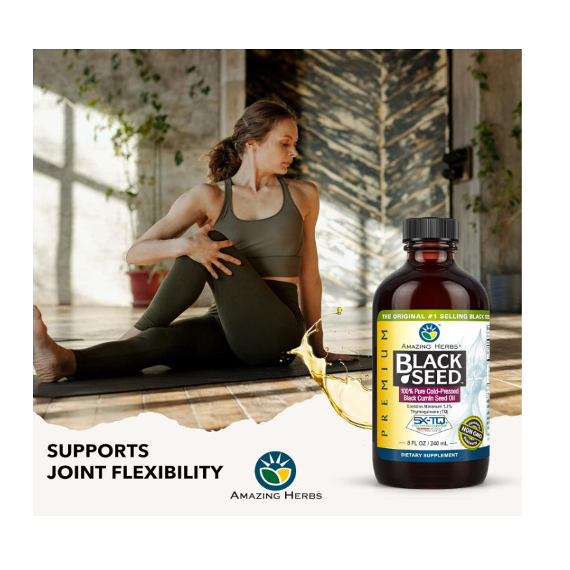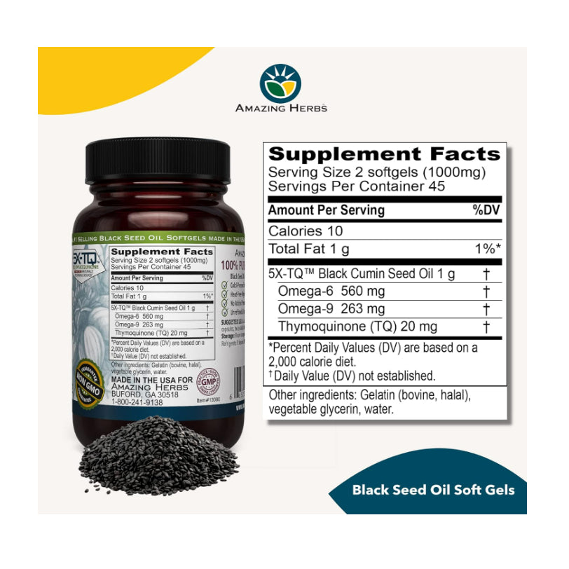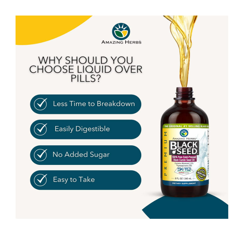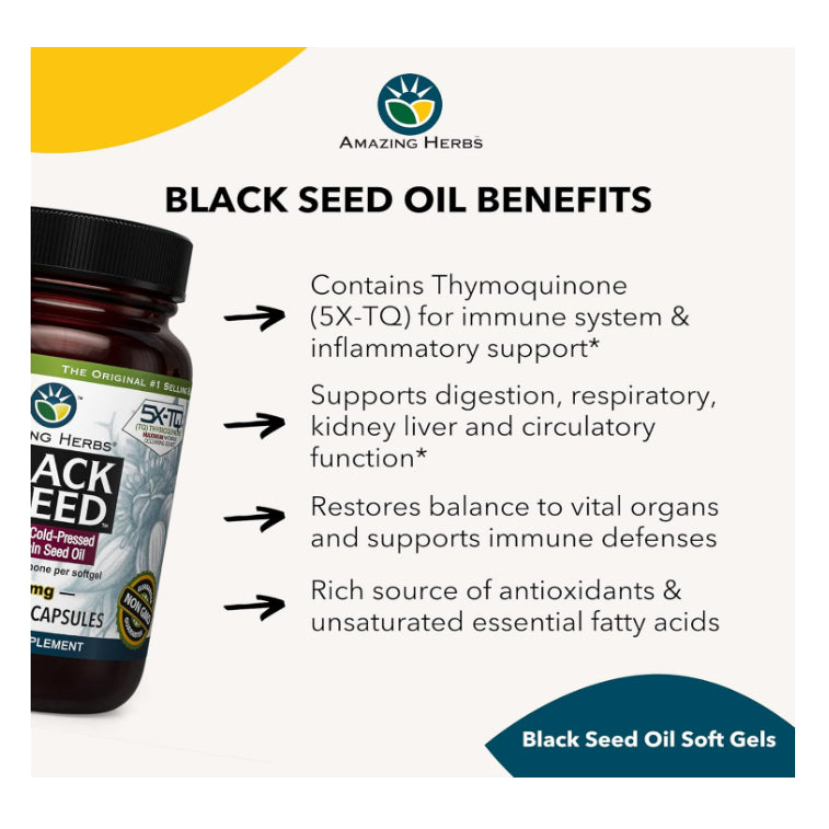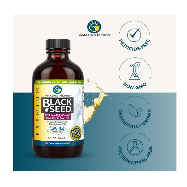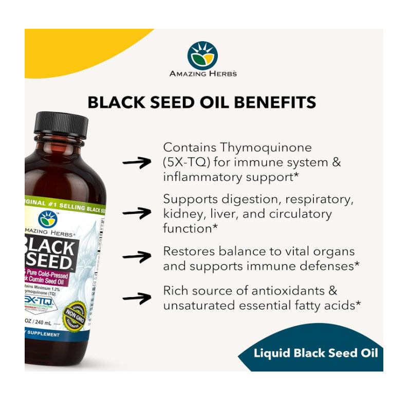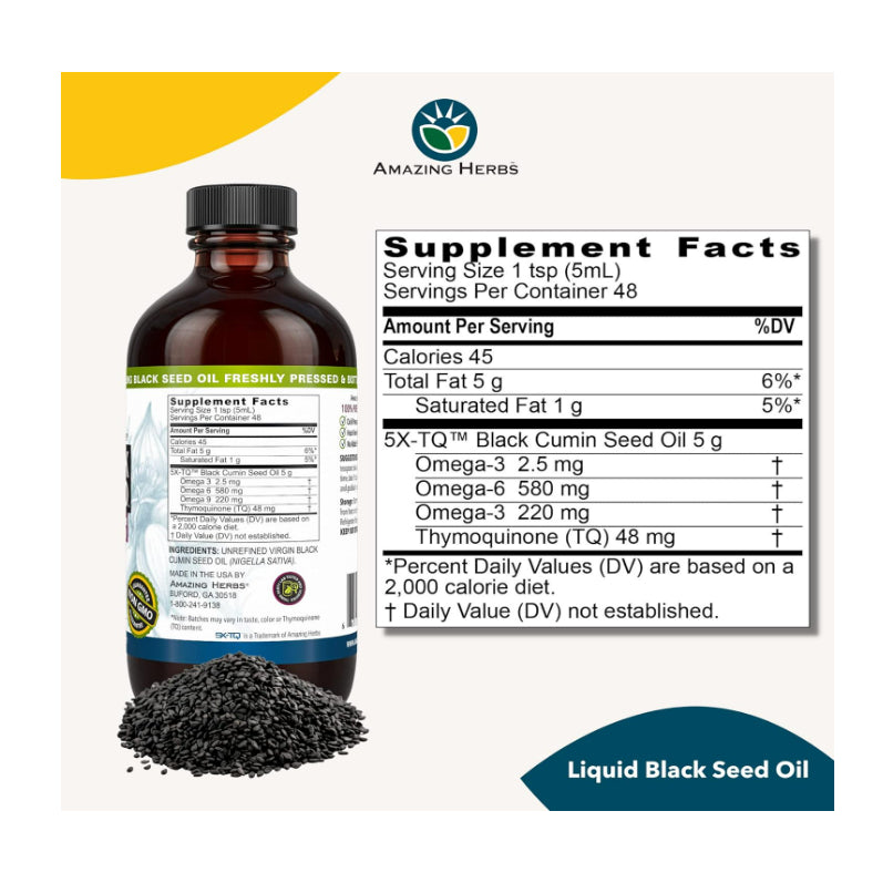 Amazing Herbs Black Seed Oil, derived from cold-pressed black cumin seeds, is renowned for its potential health benefits. Here are some of the reported benefits associated with consuming black seed oil: