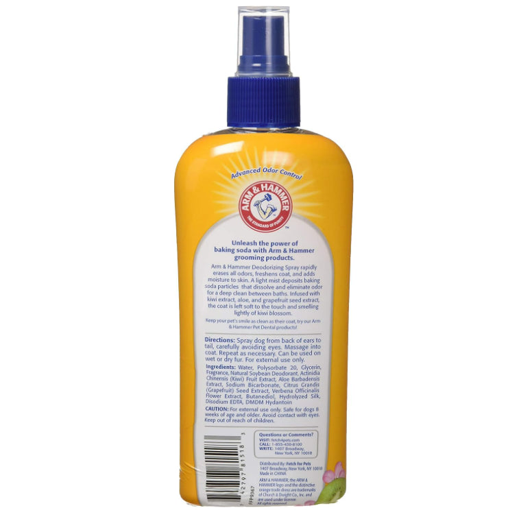 Arm & Hammer Deodorizing Spray rapidly erases all odors, freshens coat, and adds moisture to skin. A light mist deposits baking soda particles that dissolve and eliminate odor for a deep clean between baths. Infused with kiwi extract, aloe, and grapefruit seed extract, the coat is left soft to the touch and smelling lightly of kiwi blossom.