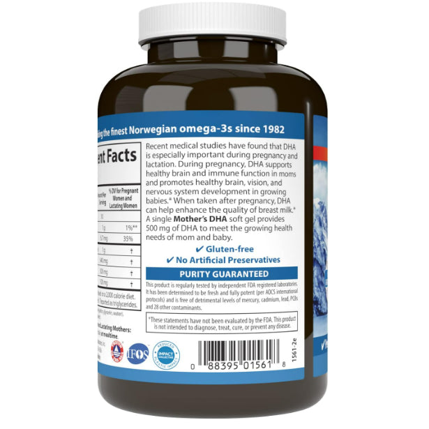 Carlson Mother's DHA is a dietary supplement formulated specifically for pregnant and breastfeeding women. Each soft gel contains 500 mg of DHA (docosahexaenoic acid), an essential omega-3 fatty acid crucial for both maternal health and fetal development.